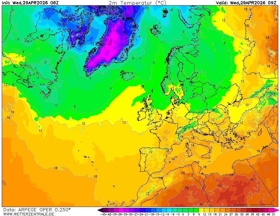 ARPEGECurrently selected. ARPEGE is the global forecast model of the French weather service (Meteo France). It is runs with a maximum resolution of approx. 7 km in Europe and mean global grid spacing of 15 km. WZ offers forecasts up to 102 hours.