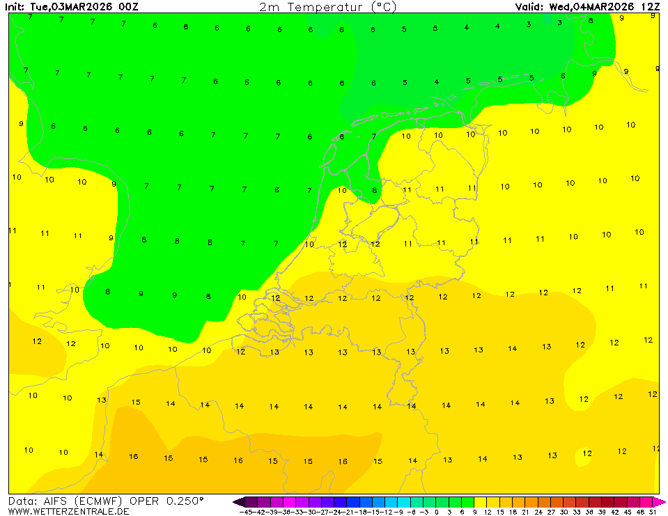 AROMEThe selected time, variable and region is available for this model. AROME is a high resolution (2.5 km) weather forecast model which is used by various weather services in Europe. On the WZ, forecasts from Meteo France and the Norwegian Weather Service are shown for western Europe and northern Europe, respectively.
