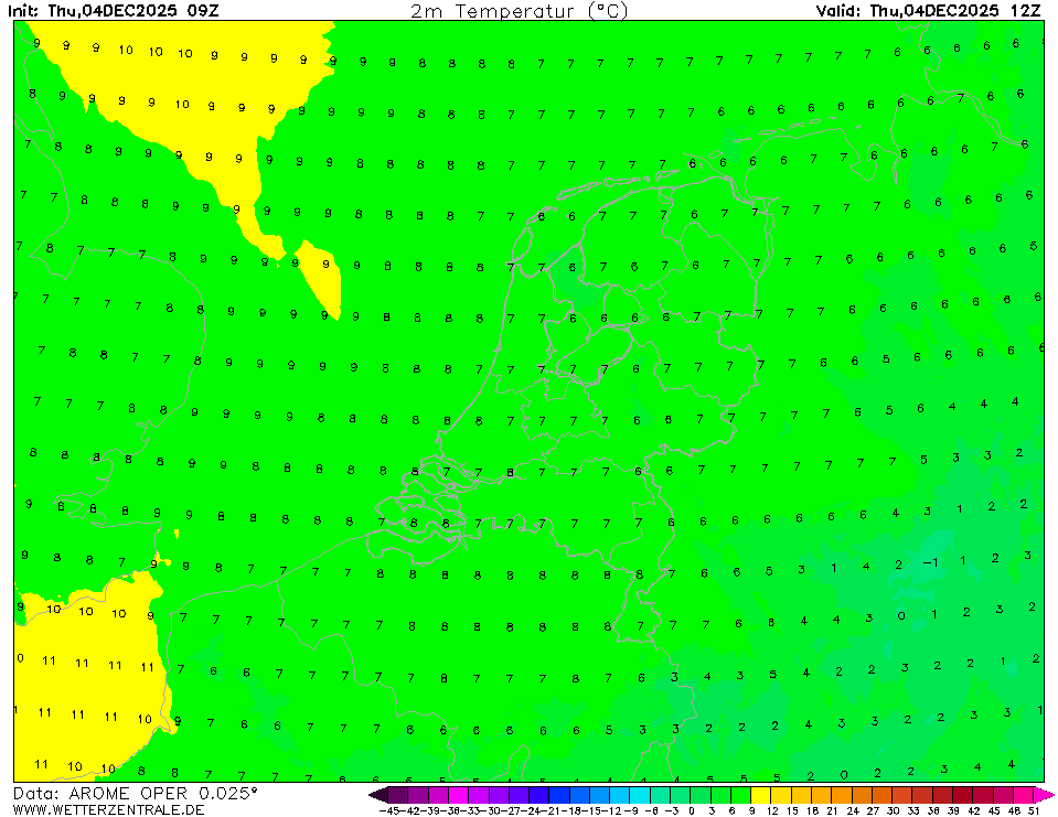 HARMONIE (KNMI-NL)The selected variable and region is available, but not for 2025-11-08, 12:00. You will switch back to the first available time step. HARMONIE is developed in a european consortium and this is the output provided by the KNMI at the supercomputing facilities in Iceland. The output from Cy43 is available at a grid spacing of 0.029 degree. These data are the raw data provided by the KNMI. The model is reinitialized every hour and run up to 60 hrs ahead.