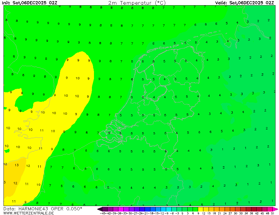 HARMONIE (KNMI-NL)The selected variable and region is available, but not for 2025-11-13, 02:00. You will switch back to the first available time step. HARMONIE is developed in a european consortium and this is the output provided by the KNMI at the supercomputing facilities in Iceland. The output from Cy43 is available at a grid spacing of 0.029 degree. These data are the raw data provided by the KNMI. The model is reinitialized every hour and run up to 60 hrs ahead.