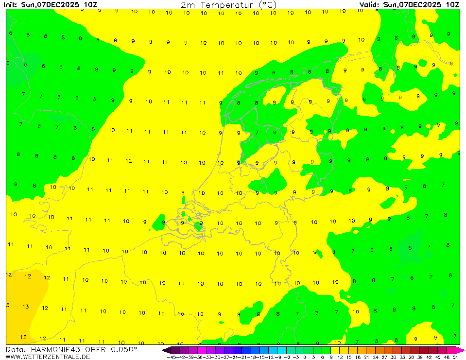 HARMONIE (KNMI-NL)The selected variable and region is available, but not for 2025-11-12, 10:00. You will switch back to the first available time step. HARMONIE is developed in a european consortium and this is the output provided by the KNMI at the supercomputing facilities in Iceland. The output from Cy43 is available at a grid spacing of 0.029 degree. These data are the raw data provided by the KNMI. The model is reinitialized every hour and run up to 60 hrs ahead.