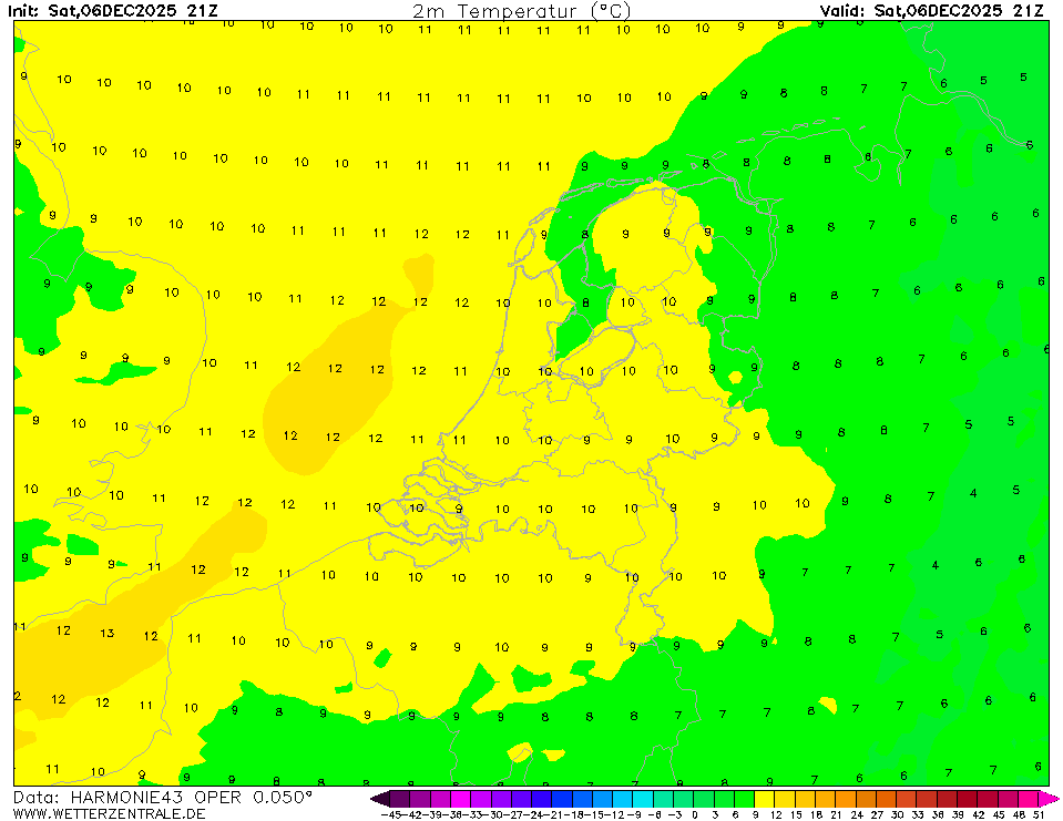 HARMONIE (KNMI-NL)The selected variable and region is available, but not for 2025-11-12, 21:00. You will switch back to the first available time step. HARMONIE is developed in a european consortium and this is the output provided by the KNMI at the supercomputing facilities in Iceland. The output from Cy43 is available at a grid spacing of 0.029 degree. These data are the raw data provided by the KNMI. The model is reinitialized every hour and run up to 60 hrs ahead.