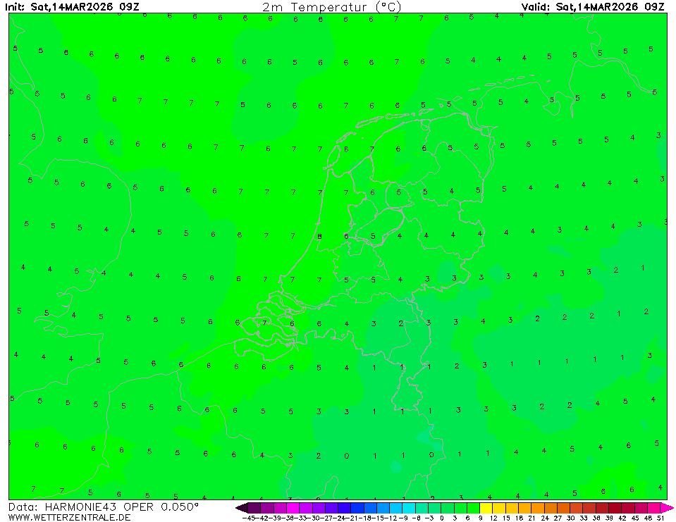 HARMONIE (KNMI-NL)The selected variable and region is available, but not for 2026-01-19, 09:00. You will switch back to the first available time step. HARMONIE is developed in a european consortium and this is the output provided by the KNMI at the supercomputing facilities in Iceland. The output from Cy43 is available at a grid spacing of 0.029 degree. These data are the raw data provided by the KNMI. The model is reinitialized every hour and run up to 60 hrs ahead.