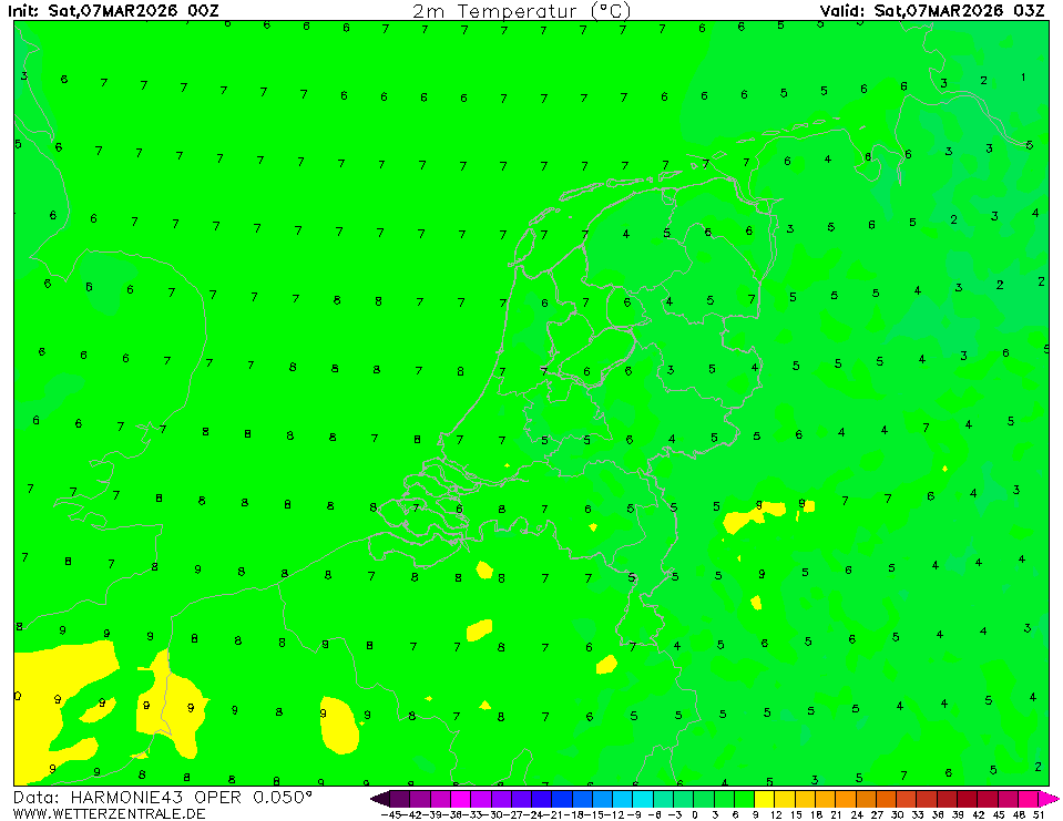 HARMONIE (KNMI-EU)Currently selected. HARMONIE is developed in a european consortium and this is the output provided by the KNMI at the supercomputing facilities in Iceland. The output from Cy43 is available at a rotated lat-lon grid and regridded at our server to a grid spacing of 0.05 degree. These data are the raw data provided by the KNMI. The model is reinitialized every hour and run up to 60 hrs ahead.