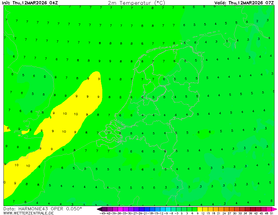 HARMONIE (KNMI-NL)The selected variable and region is available, but not for 2025-12-10, 07:00. You will switch back to the first available time step. HARMONIE is developed in a european consortium and this is the output provided by the KNMI at the supercomputing facilities in Iceland. The output from Cy43 is available at a grid spacing of 0.029 degree. These data are the raw data provided by the KNMI. The model is reinitialized every hour and run up to 60 hrs ahead.