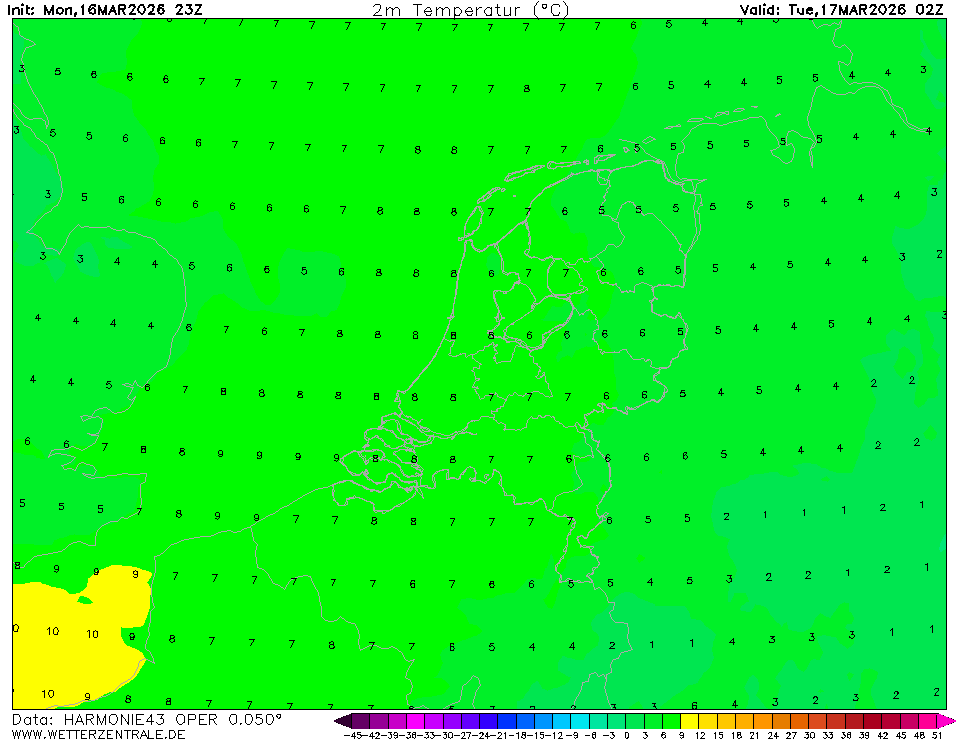 HARMONIE (KNMI-EU)Currently selected. HARMONIE is developed in a european consortium and this is the output provided by the KNMI at the supercomputing facilities in Iceland. The output from Cy43 is available at a rotated lat-lon grid and regridded at our server to a grid spacing of 0.05 degree. These data are the raw data provided by the KNMI. The model is reinitialized every hour and run up to 60 hrs ahead.