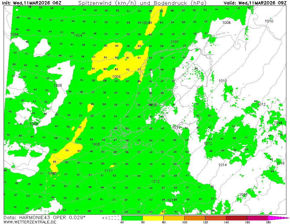 HARMONIE (KNMI-NL)Currently selected. HARMONIE is developed in a european consortium and this is the output provided by the KNMI at the supercomputing facilities in Iceland. The output from Cy43 is available at a grid spacing of 0.029 degree. These data are the raw data provided by the KNMI. The model is reinitialized every hour and run up to 60 hrs ahead.