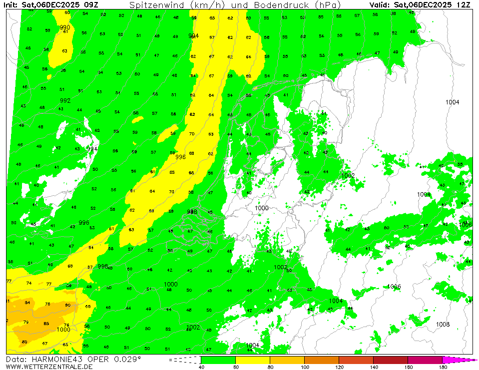 HARMONIE (KNMI-NL)Currently selected. HARMONIE is developed in a european consortium and this is the output provided by the KNMI at the supercomputing facilities in Iceland. The output from Cy43 is available at a grid spacing of 0.029 degree. These data are the raw data provided by the KNMI. The model is reinitialized every hour and run up to 60 hrs ahead.