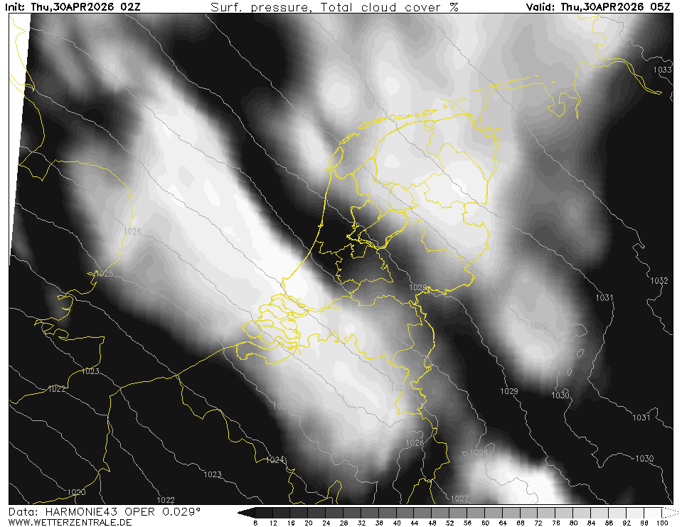 HARMONIE (KNMI-NL)Currently selected. HARMONIE is developed in a european consortium and this is the output provided by the KNMI at the supercomputing facilities in Iceland. The output from Cy43 is available at a grid spacing of 0.029 degree. These data are the raw data provided by the KNMI. The model is reinitialized every hour and run up to 60 hrs ahead.