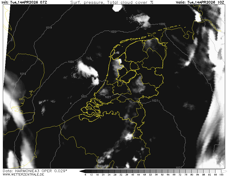 HARMONIE (KNMI-NL)Currently selected. HARMONIE is developed in a european consortium and this is the output provided by the KNMI at the supercomputing facilities in Iceland. The output from Cy43 is available at a grid spacing of 0.029 degree. These data are the raw data provided by the KNMI. The model is reinitialized every hour and run up to 60 hrs ahead.