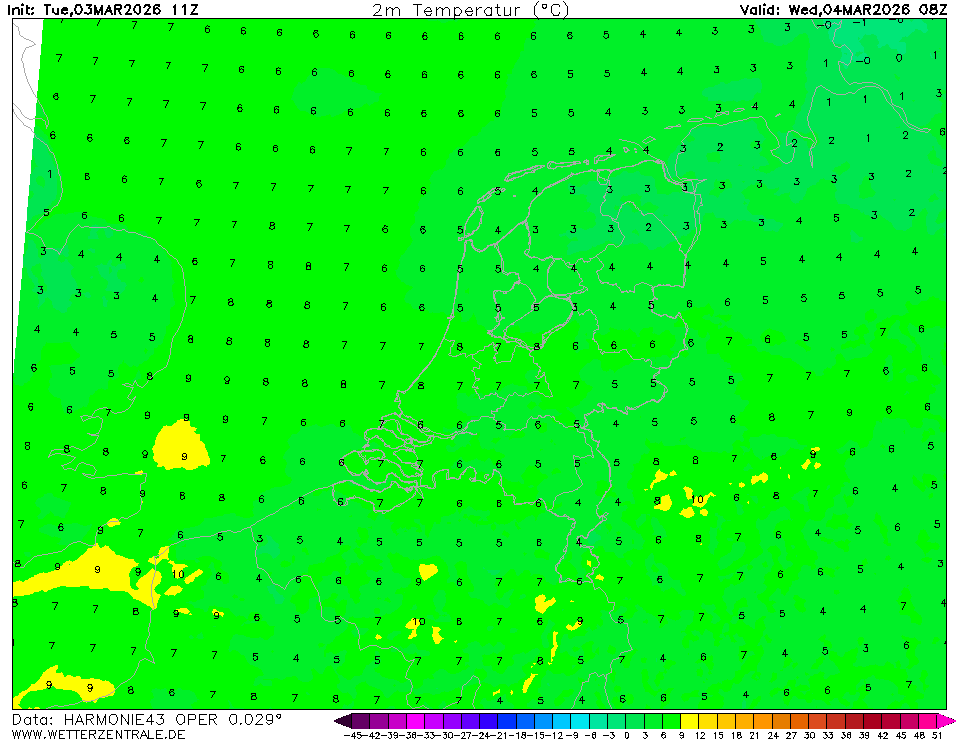 AROMEThe selected time, variable and region is available for this model. AROME is a high resolution (2.5 km) weather forecast model which is used by various weather services in Europe. On the WZ, forecasts from Meteo France and the Norwegian Weather Service are shown for western Europe and northern Europe, respectively.