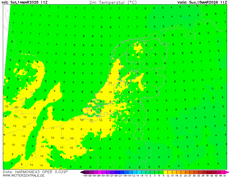 HARMONIE (KNMI-EU)The selected time, variable and region is available for this model. HARMONIE is developed in a european consortium and this is the output provided by the KNMI at the supercomputing facilities in Iceland. The output from Cy43 is available at a rotated lat-lon grid and regridded at our server to a grid spacing of 0.05 degree. These data are the raw data provided by the KNMI. The model is reinitialized every hour and run up to 60 hrs ahead.