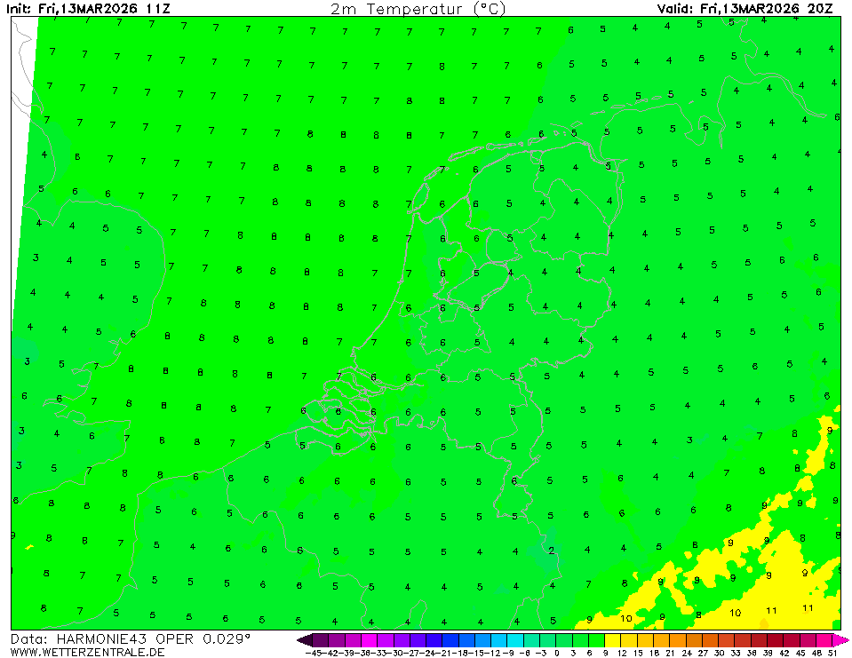 AROMEThe selected time, variable and region is available for this model. AROME is a high resolution (2.5 km) weather forecast model which is used by various weather services in Europe. On the WZ, forecasts from Meteo France and the Norwegian Weather Service are shown for western Europe and northern Europe, respectively.