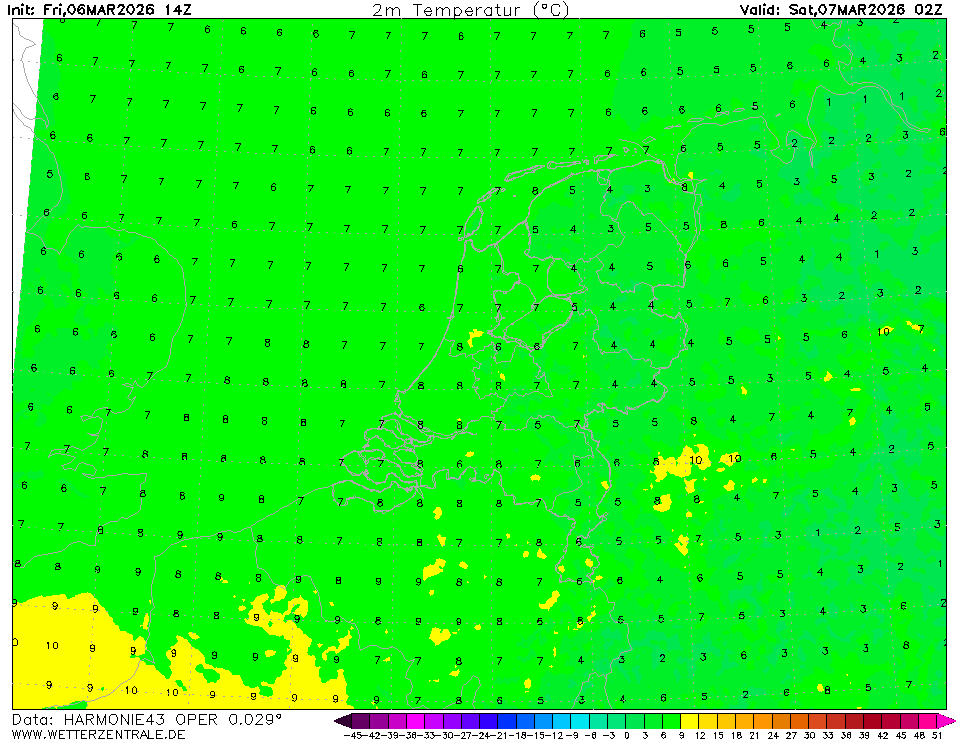 HARMONIE (KNMI-EU)The selected time, variable and region is available for this model. HARMONIE is developed in a european consortium and this is the output provided by the KNMI at the supercomputing facilities in Iceland. The output from Cy43 is available at a rotated lat-lon grid and regridded at our server to a grid spacing of 0.05 degree. These data are the raw data provided by the KNMI. The model is reinitialized every hour and run up to 60 hrs ahead.