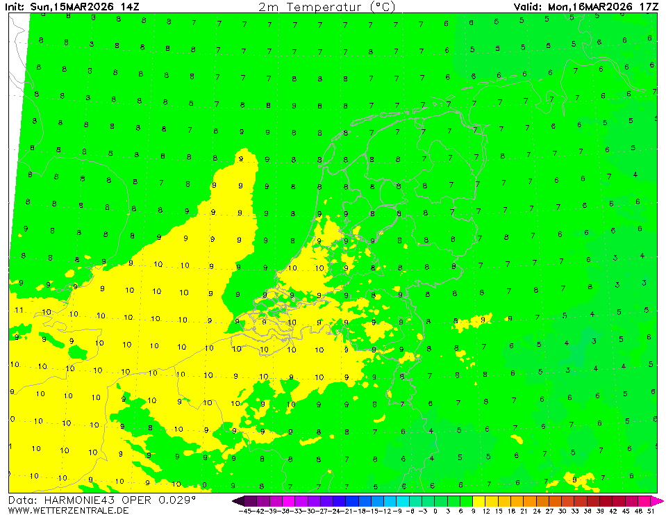 HARMONIE (KNMI-EU)The selected time, variable and region is available for this model. HARMONIE is developed in a european consortium and this is the output provided by the KNMI at the supercomputing facilities in Iceland. The output from Cy43 is available at a rotated lat-lon grid and regridded at our server to a grid spacing of 0.05 degree. These data are the raw data provided by the KNMI. The model is reinitialized every hour and run up to 60 hrs ahead.