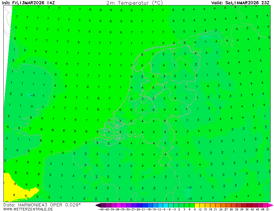 HARMONIE (KNMI-EU)The selected time, variable and region is available for this model. HARMONIE is developed in a european consortium and this is the output provided by the KNMI at the supercomputing facilities in Iceland. The output from Cy43 is available at a rotated lat-lon grid and regridded at our server to a grid spacing of 0.05 degree. These data are the raw data provided by the KNMI. The model is reinitialized every hour and run up to 60 hrs ahead.