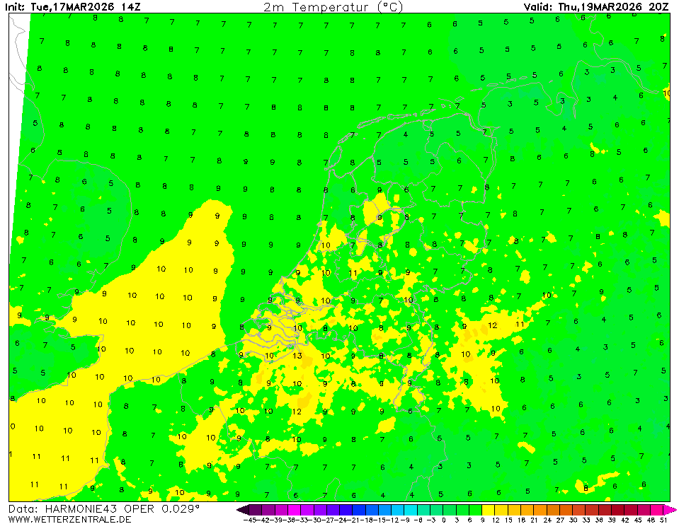 HARMONIE (KNMI-EU)The selected variable and region is available, but not for 2026-02-09, 20:00. You will switch back to the first available time step. HARMONIE is developed in a european consortium and this is the output provided by the KNMI at the supercomputing facilities in Iceland. The output from Cy43 is available at a rotated lat-lon grid and regridded at our server to a grid spacing of 0.05 degree. These data are the raw data provided by the KNMI. The model is reinitialized every hour and run up to 60 hrs ahead.