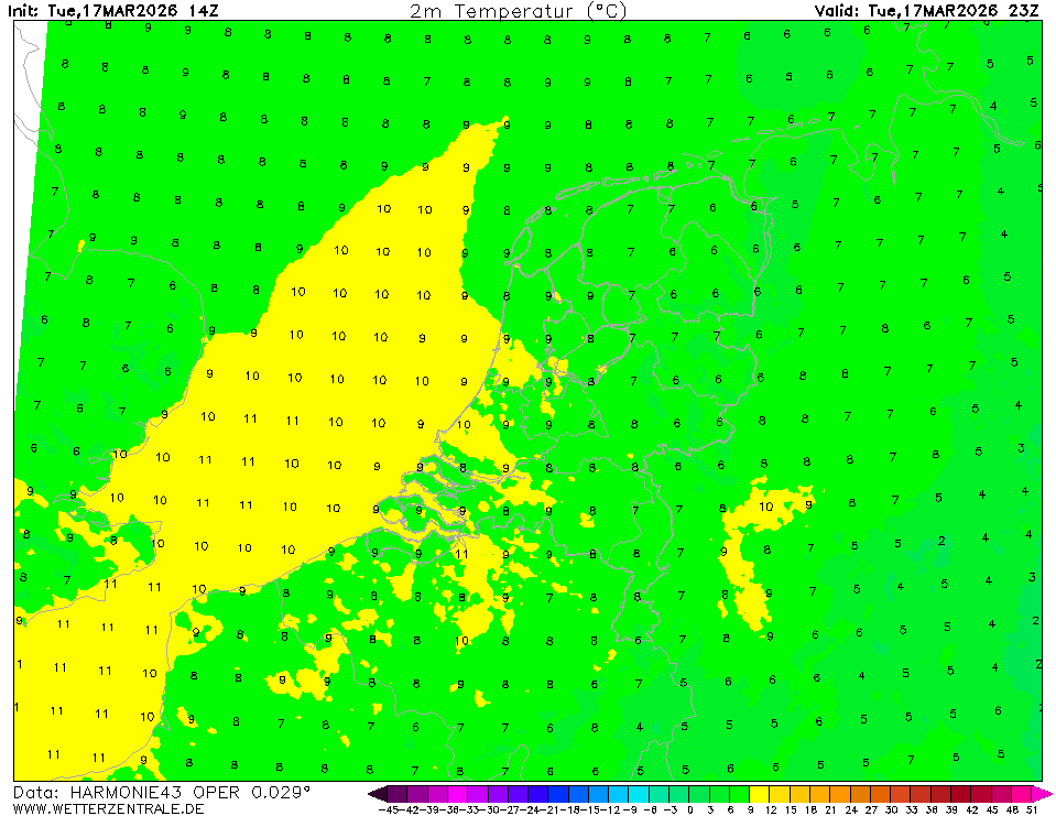 AROMEThe selected time, variable and region is available for this model. AROME is a high resolution (2.5 km) weather forecast model which is used by various weather services in Europe. On the WZ, forecasts from Meteo France and the Norwegian Weather Service are shown for western Europe and northern Europe, respectively.