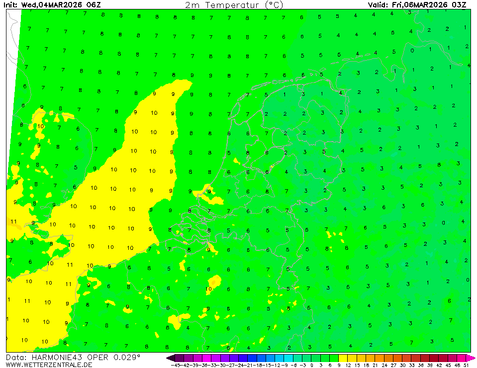 HARMONIE (KNMI-EU)The selected time, variable and region is available for this model. HARMONIE is developed in a european consortium and this is the output provided by the KNMI at the supercomputing facilities in Iceland. The output from Cy43 is available at a rotated lat-lon grid and regridded at our server to a grid spacing of 0.05 degree. These data are the raw data provided by the KNMI. The model is reinitialized every hour and run up to 60 hrs ahead.