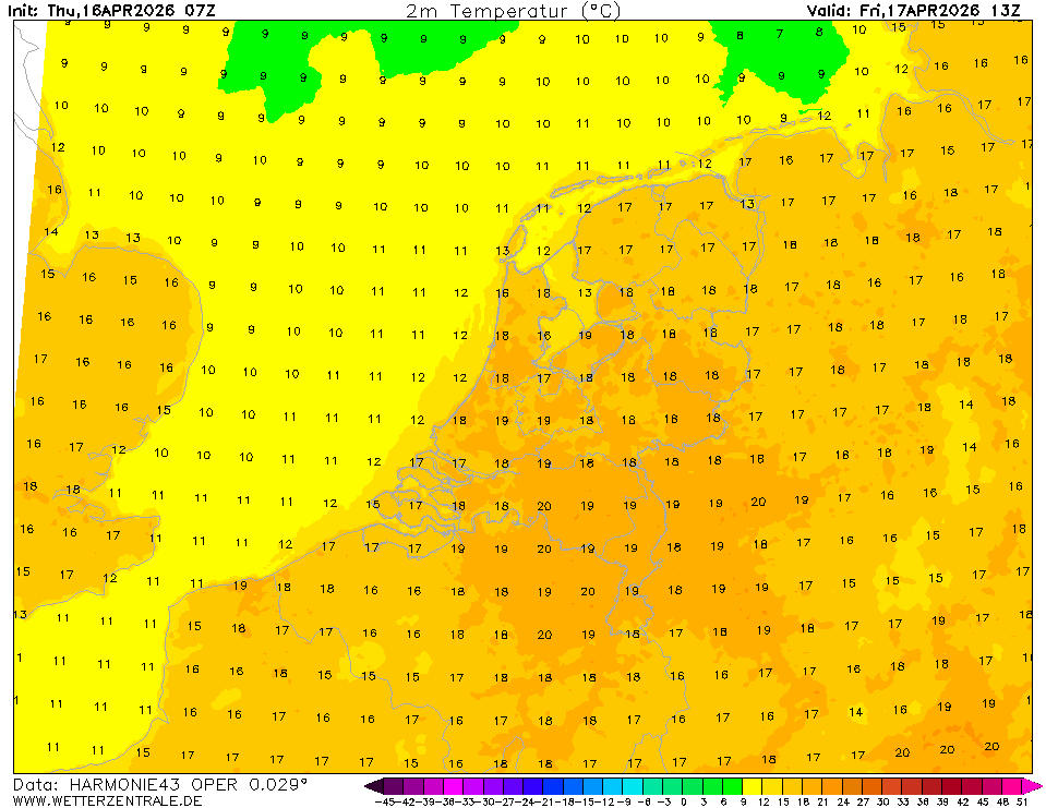 HARMONIE (KNMI-EU)The selected time, variable and region is available for this model. HARMONIE is developed in a european consortium and this is the output provided by the KNMI at the supercomputing facilities in Iceland. The output from Cy43 is available at a rotated lat-lon grid and regridded at our server to a grid spacing of 0.05 degree. These data are the raw data provided by the KNMI. The model is reinitialized every hour and run up to 60 hrs ahead.
