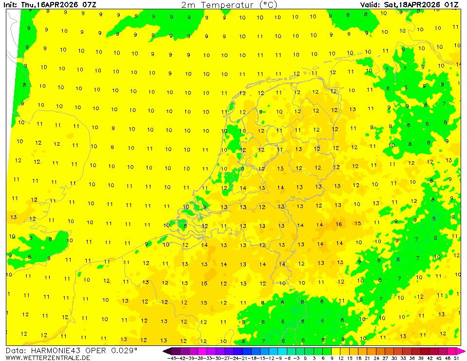 HARMONIE (KNMI-EU)The selected time, variable and region is available for this model. HARMONIE is developed in a european consortium and this is the output provided by the KNMI at the supercomputing facilities in Iceland. The output from Cy43 is available at a rotated lat-lon grid and regridded at our server to a grid spacing of 0.05 degree. These data are the raw data provided by the KNMI. The model is reinitialized every hour and run up to 60 hrs ahead.