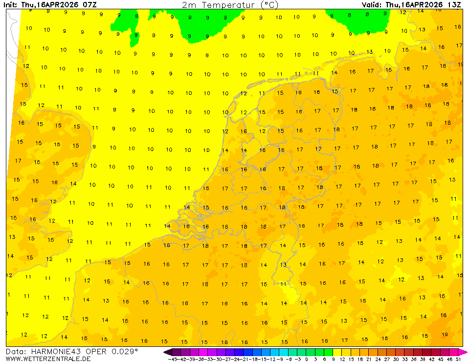 HARMONIE (KNMI-EU)The selected time, variable and region is available for this model. HARMONIE is developed in a european consortium and this is the output provided by the KNMI at the supercomputing facilities in Iceland. The output from Cy43 is available at a rotated lat-lon grid and regridded at our server to a grid spacing of 0.05 degree. These data are the raw data provided by the KNMI. The model is reinitialized every hour and run up to 60 hrs ahead.