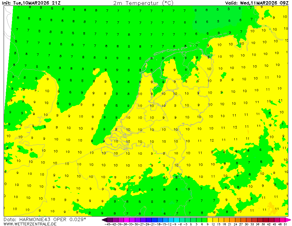 AROMEThe selected time, variable and region is available for this model. AROME is a high resolution (2.5 km) weather forecast model which is used by various weather services in Europe. On the WZ, forecasts from Meteo France and the Norwegian Weather Service are shown for western Europe and northern Europe, respectively.