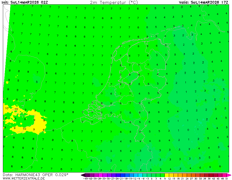 HARMONIE (KNMI-EU)The selected time, variable and region is available for this model. HARMONIE is developed in a european consortium and this is the output provided by the KNMI at the supercomputing facilities in Iceland. The output from Cy43 is available at a rotated lat-lon grid and regridded at our server to a grid spacing of 0.05 degree. These data are the raw data provided by the KNMI. The model is reinitialized every hour and run up to 60 hrs ahead.