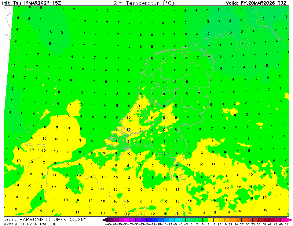 HARMONIE (KNMI-EU)The selected time, variable and region is available for this model. HARMONIE is developed in a european consortium and this is the output provided by the KNMI at the supercomputing facilities in Iceland. The output from Cy43 is available at a rotated lat-lon grid and regridded at our server to a grid spacing of 0.05 degree. These data are the raw data provided by the KNMI. The model is reinitialized every hour and run up to 60 hrs ahead.