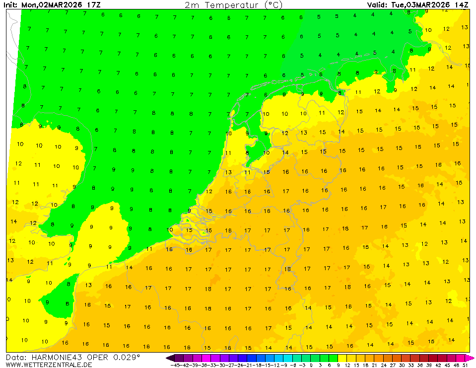 HARMONIE (KNMI-EU)The selected time, variable and region is available for this model. HARMONIE is developed in a european consortium and this is the output provided by the KNMI at the supercomputing facilities in Iceland. The output from Cy43 is available at a rotated lat-lon grid and regridded at our server to a grid spacing of 0.05 degree. These data are the raw data provided by the KNMI. The model is reinitialized every hour and run up to 60 hrs ahead.
