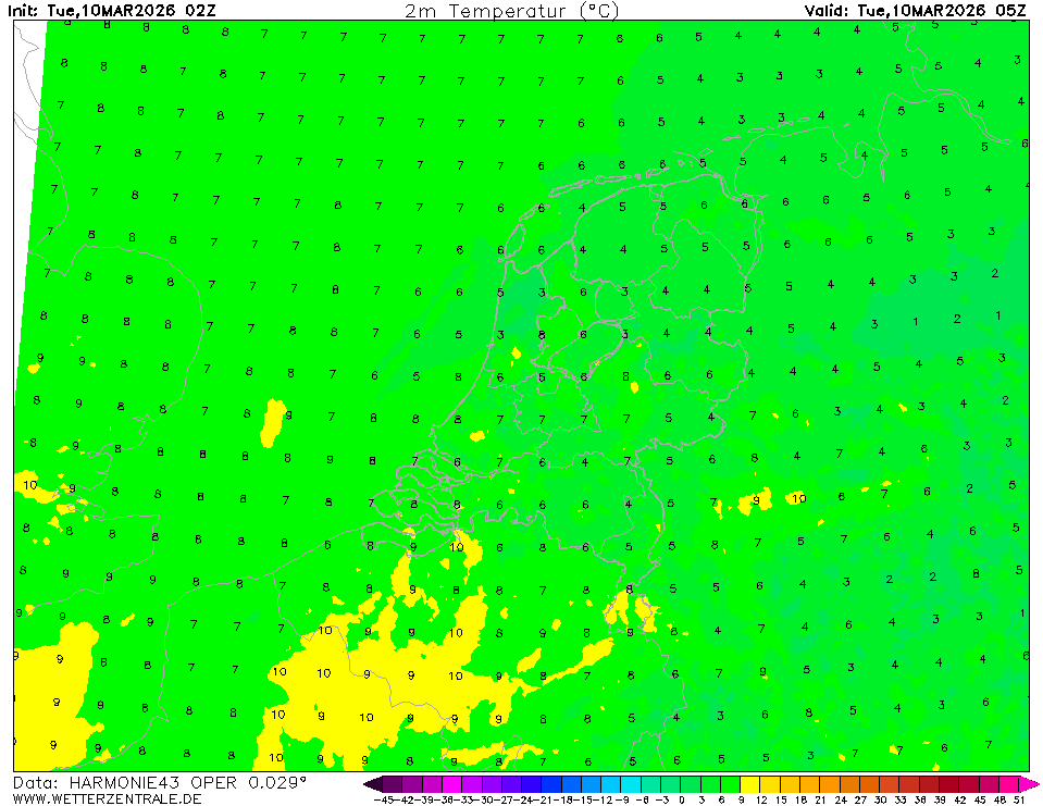 AROMEThe selected time, variable and region is available for this model. AROME is a high resolution (2.5 km) weather forecast model which is used by various weather services in Europe. On the WZ, forecasts from Meteo France and the Norwegian Weather Service are shown for western Europe and northern Europe, respectively.