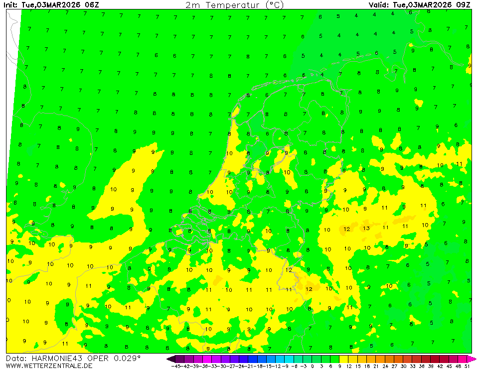 HARMONIE (KNMI-EU)The selected variable and region is available, but not for 2025-12-09, 09:00. You will switch back to the first available time step. HARMONIE is developed in a european consortium and this is the output provided by the KNMI at the supercomputing facilities in Iceland. The output from Cy43 is available at a rotated lat-lon grid and regridded at our server to a grid spacing of 0.05 degree. These data are the raw data provided by the KNMI. The model is reinitialized every hour and run up to 60 hrs ahead.