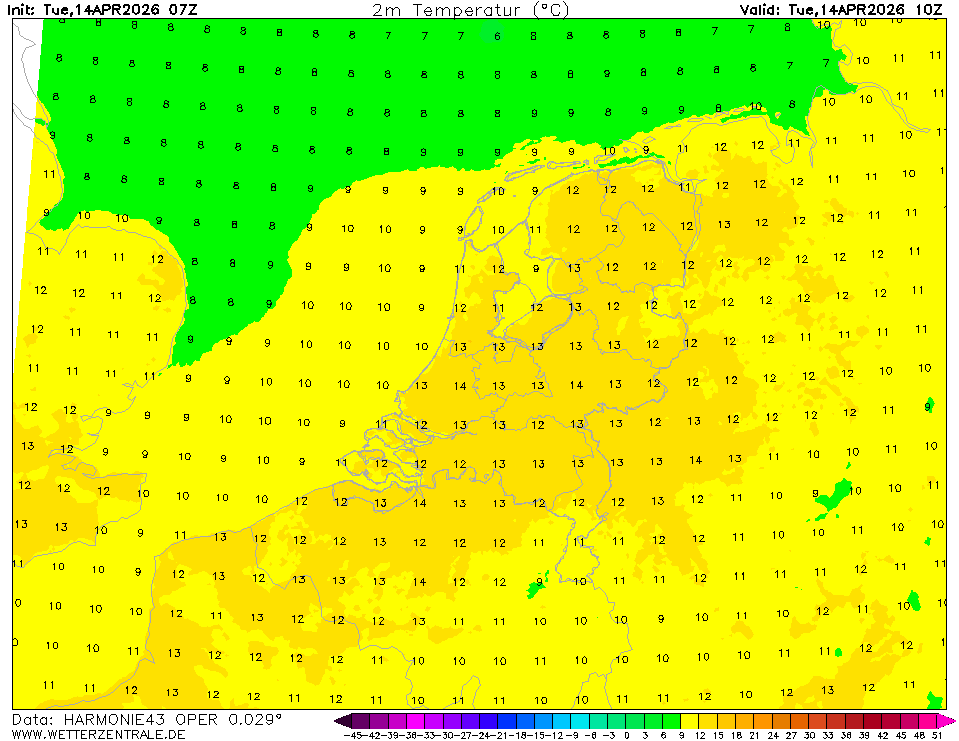 HARMONIE (KNMI-EU)The selected time, variable and region is available for this model. HARMONIE is developed in a european consortium and this is the output provided by the KNMI at the supercomputing facilities in Iceland. The output from Cy43 is available at a rotated lat-lon grid and regridded at our server to a grid spacing of 0.05 degree. These data are the raw data provided by the KNMI. The model is reinitialized every hour and run up to 60 hrs ahead.