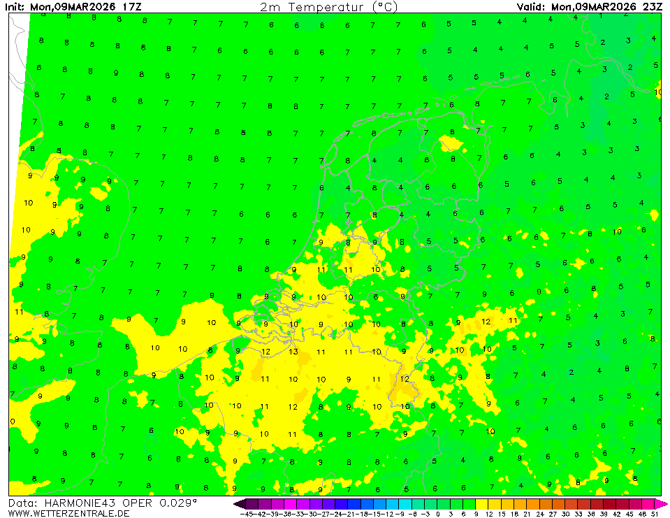 HARMONIE (KNMI-EU)The selected variable and region is available, but not for 2025-12-10, 23:00. You will switch back to the first available time step. HARMONIE is developed in a european consortium and this is the output provided by the KNMI at the supercomputing facilities in Iceland. The output from Cy43 is available at a rotated lat-lon grid and regridded at our server to a grid spacing of 0.05 degree. These data are the raw data provided by the KNMI. The model is reinitialized every hour and run up to 60 hrs ahead.