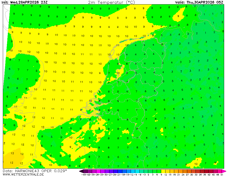 HARMONIE (KNMI-EU)The selected variable and region is available, but not for 2026-04-15, 05:00. You will switch back to the first available time step. HARMONIE is developed in a european consortium and this is the output provided by the KNMI at the supercomputing facilities in Iceland. The output from Cy43 is available at a rotated lat-lon grid and regridded at our server to a grid spacing of 0.05 degree. These data are the raw data provided by the KNMI. The model is reinitialized every hour and run up to 60 hrs ahead.