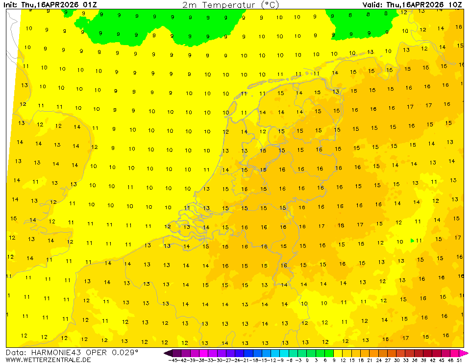HARMONIE (KNMI-EU)The selected time, variable and region is available for this model. HARMONIE is developed in a european consortium and this is the output provided by the KNMI at the supercomputing facilities in Iceland. The output from Cy43 is available at a rotated lat-lon grid and regridded at our server to a grid spacing of 0.05 degree. These data are the raw data provided by the KNMI. The model is reinitialized every hour and run up to 60 hrs ahead.