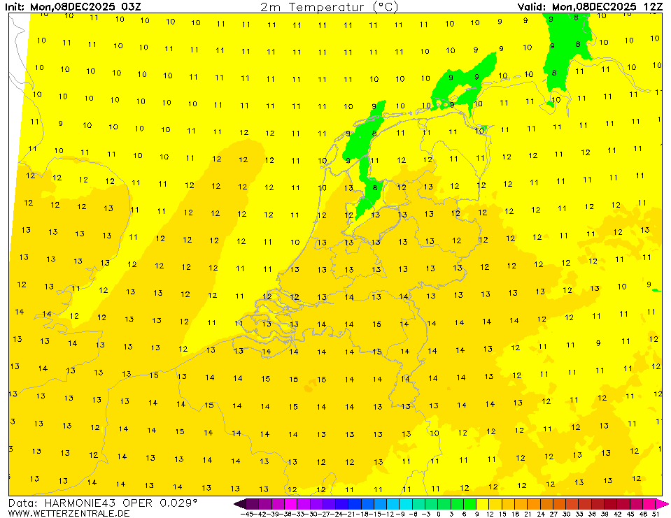 HARMONIE (KNMI-EU)The selected time, variable and region is available for this model. HARMONIE is developed in a european consortium and this is the output provided by the KNMI at the supercomputing facilities in Iceland. The output from Cy43 is available at a rotated lat-lon grid and regridded at our server to a grid spacing of 0.05 degree. These data are the raw data provided by the KNMI. The model is reinitialized every hour and run up to 60 hrs ahead.