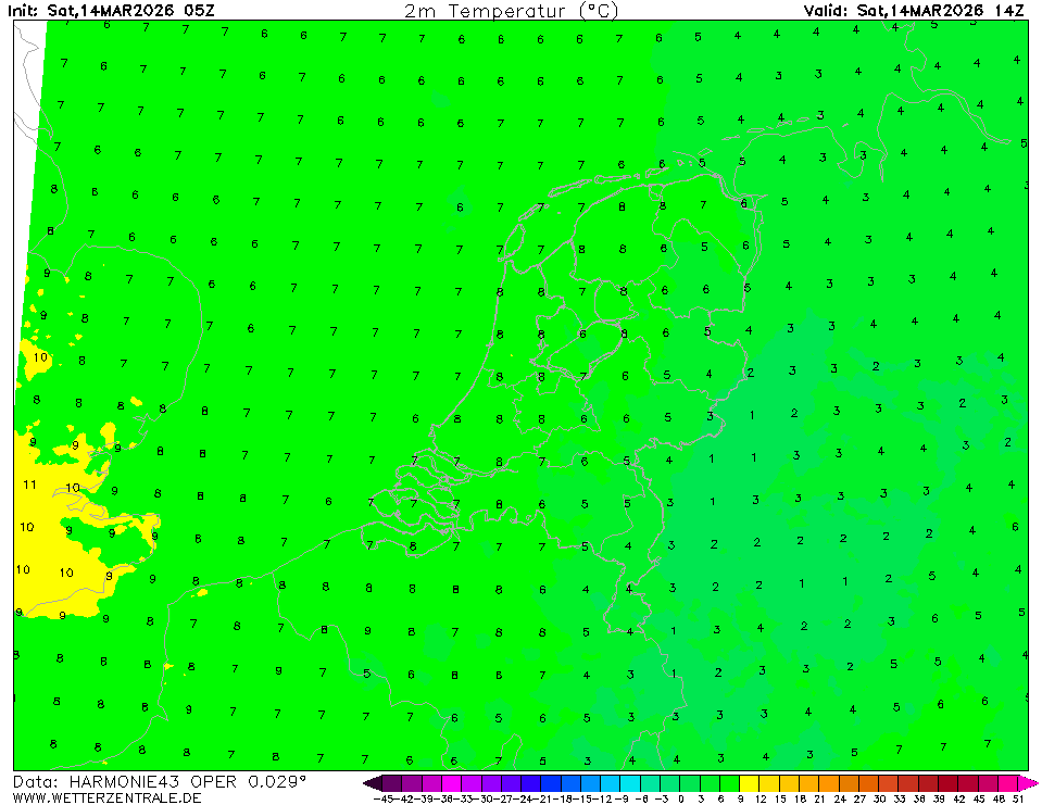HARMONIE (KNMI-EU)The selected time, variable and region is available for this model. HARMONIE is developed in a european consortium and this is the output provided by the KNMI at the supercomputing facilities in Iceland. The output from Cy43 is available at a rotated lat-lon grid and regridded at our server to a grid spacing of 0.05 degree. These data are the raw data provided by the KNMI. The model is reinitialized every hour and run up to 60 hrs ahead.