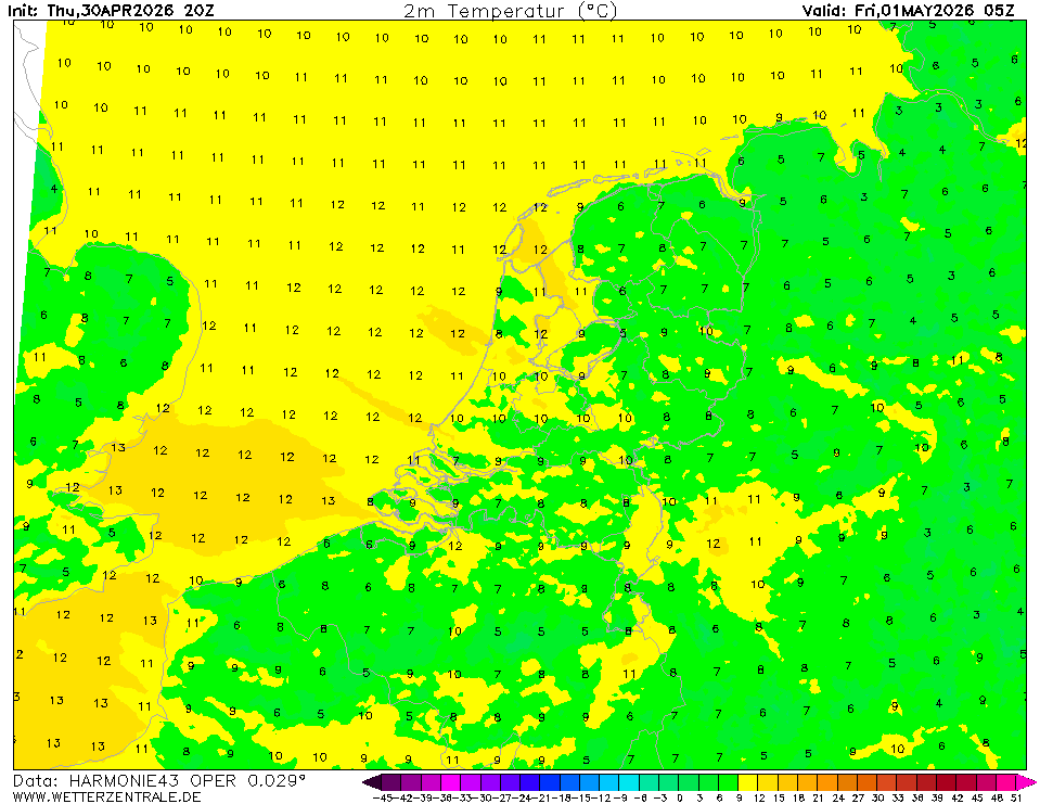 HARMONIE (KNMI-NL)Currently selected. HARMONIE is developed in a european consortium and this is the output provided by the KNMI at the supercomputing facilities in Iceland. The output from Cy43 is available at a grid spacing of 0.029 degree. These data are the raw data provided by the KNMI. The model is reinitialized every hour and run up to 60 hrs ahead.