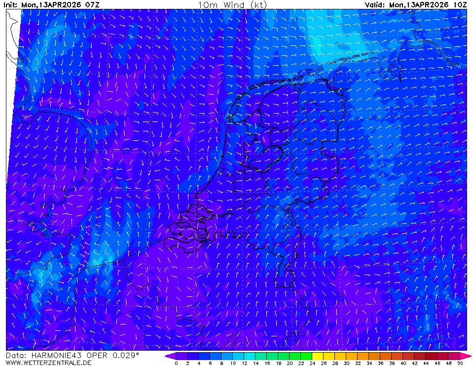 HARMONIE (KNMI-NL)Currently selected. HARMONIE is developed in a european consortium and this is the output provided by the KNMI at the supercomputing facilities in Iceland. The output from Cy43 is available at a grid spacing of 0.029 degree. These data are the raw data provided by the KNMI. The model is reinitialized every hour and run up to 60 hrs ahead.