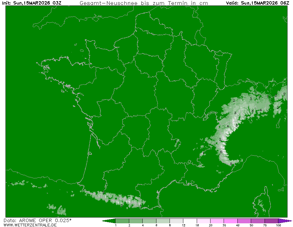 ARPEGEThe selected variable and region is available, but not for 2026-02-15, 06:00. You will switch back to the first available time step. ARPEGE is the global forecast model of the French weather service (Meteo France). It is runs with a maximum resolution of approx. 7 km in Europe and mean global grid spacing of 15 km. WZ offers forecasts up to 102 hours.