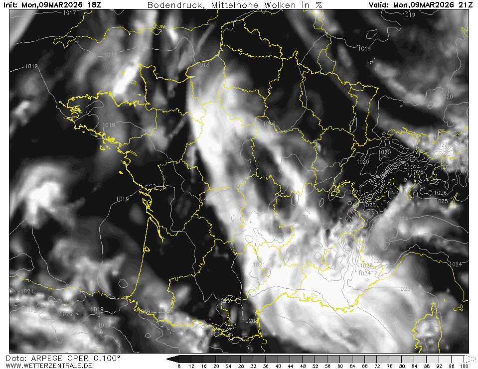 ARPEGECurrently selected. ARPEGE is the global forecast model of the French weather service (Meteo France). It is runs with a maximum resolution of approx. 7 km in Europe and mean global grid spacing of 15 km. WZ offers forecasts up to 102 hours.