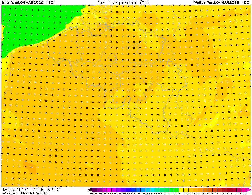 WRFThe selected variable and region is available, but not for 2026-02-16, 15:00. You will switch back to the first available time step. WRF (Weather Research and Forecasting model) is a freely available weather forecast model. WRF version 3.9 is run on the WZ servers and offers 4 forecasts per day up to 72 hours. It is currently run with a horizontal grid spacing of 5 km and uses the WRF single-moment 3 class microphysics scheme, the YSU PBL scheme and the Dudhia radiation scheme.