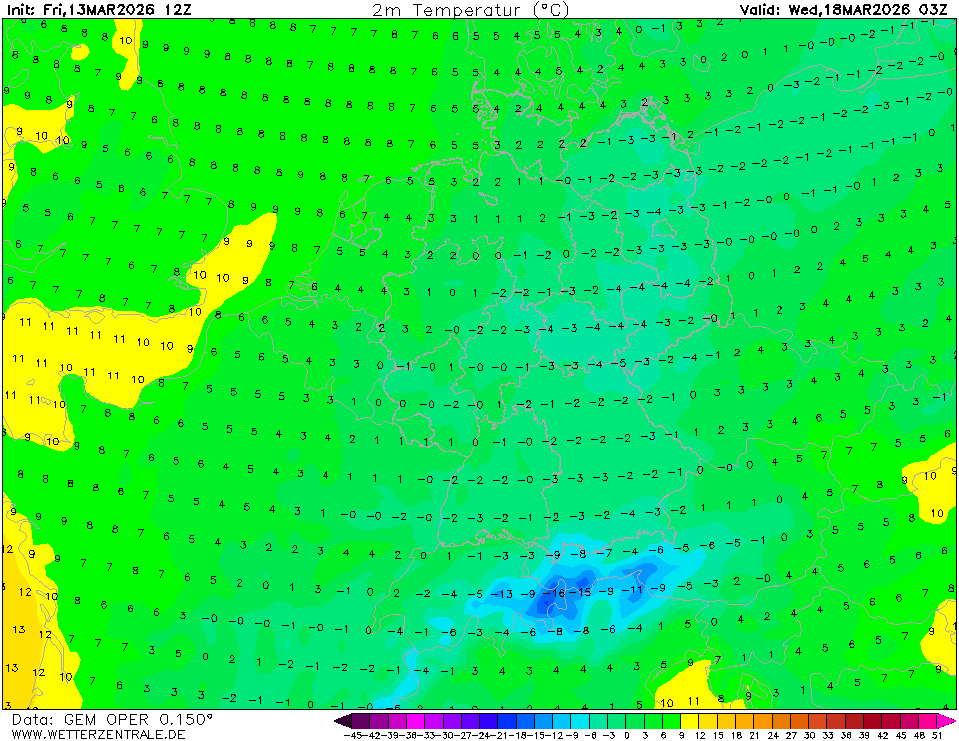 ICONThe selected time, variable and region is available for this model. ICON is the global weather forecast of the German weather service (DWD) with a grid spacing of approx. 13 km globally (Europe nest: 6 km). Model output is available up to 180 hours ahead for the 0Z and 12Z runs, and up to 120 hours for the 6Z and 18Z runs.