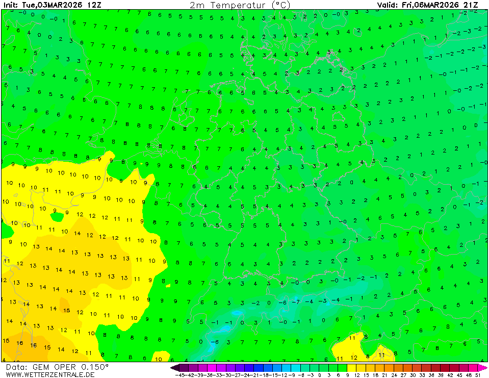 ICONThe selected time, variable and region is available for this model. ICON is the global weather forecast of the German weather service (DWD) with a grid spacing of approx. 13 km globally (Europe nest: 6 km). Model output is available up to 180 hours ahead for the 0Z and 12Z runs, and up to 120 hours for the 6Z and 18Z runs.