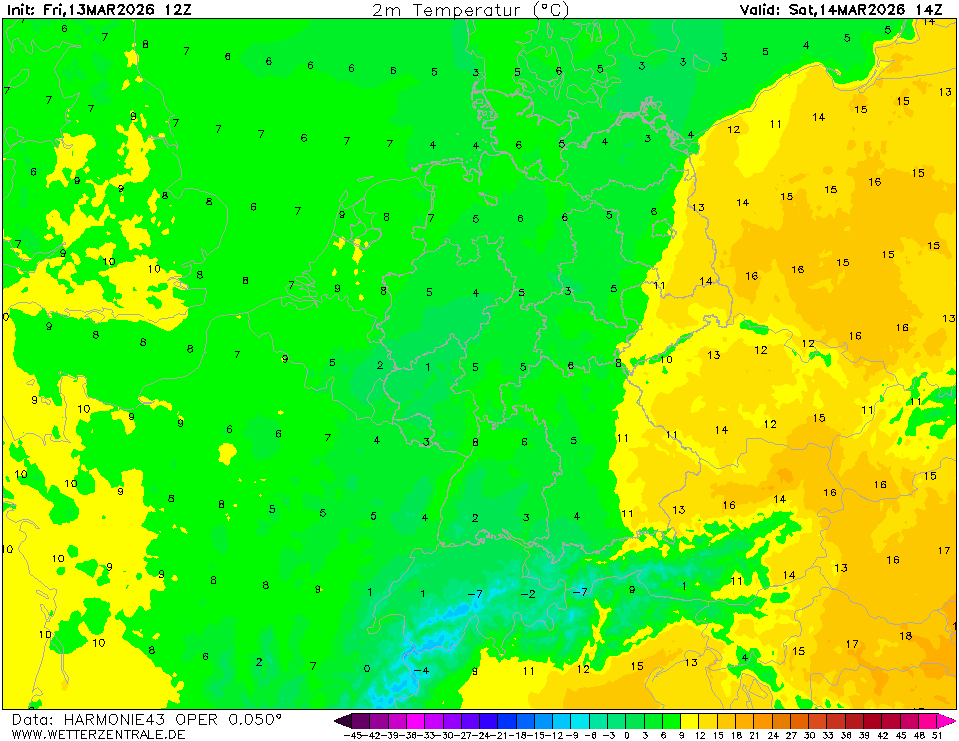 ARPEGEThe selected variable and region is available, but not for 2025-12-14, 14:00. You will switch back to the first available time step. ARPEGE is the global forecast model of the French weather service (Meteo France). It is runs with a maximum resolution of approx. 7 km in Europe and mean global grid spacing of 15 km. WZ offers forecasts up to 102 hours.