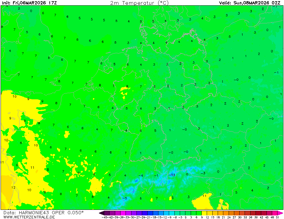 NAVGEMThe selected variable and region is available, but not for 2026-02-13, 02:00. You will switch back to the first available time step. NAVGEM is a model run by the NOAA and serves the US navy with weather forecasts. The WZ maps are based on data that is available from the NCEP server with a grid spacing of 0.5 degree and is updated twice daily (7 and 19 UTC).