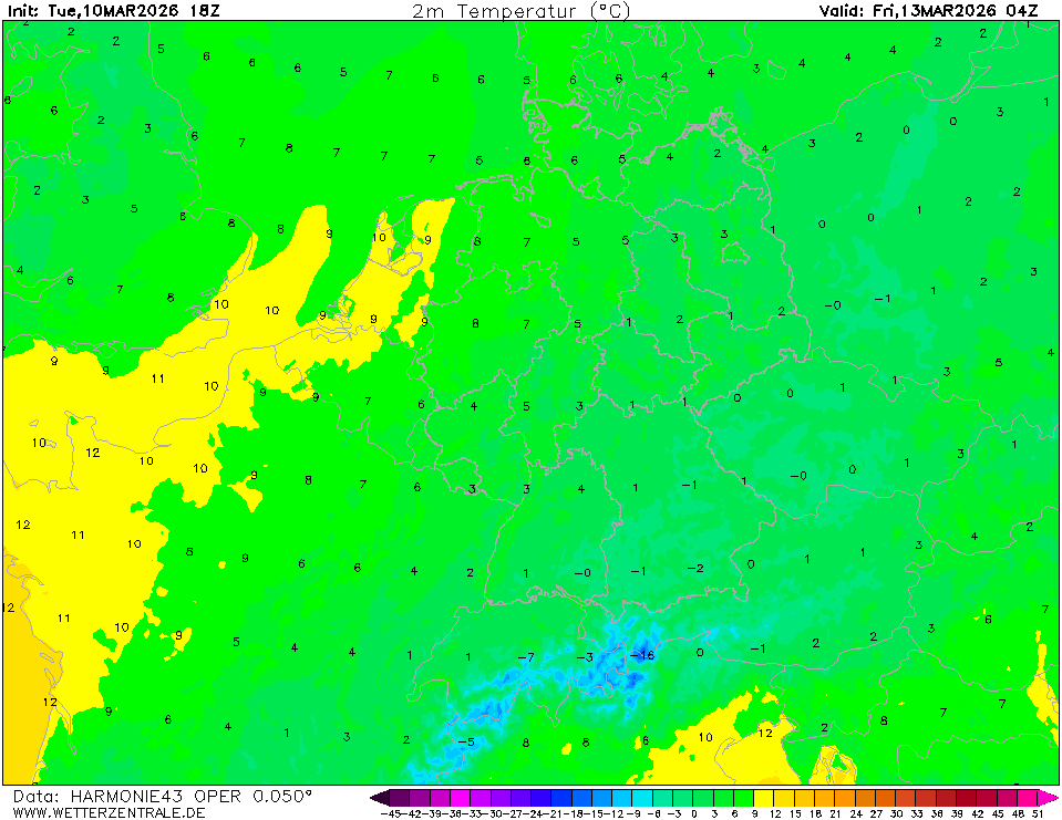 ICONThe selected time, variable and region is available for this model. ICON is the global weather forecast of the German weather service (DWD) with a grid spacing of approx. 13 km globally (Europe nest: 6 km). Model output is available up to 180 hours ahead for the 0Z and 12Z runs, and up to 120 hours for the 6Z and 18Z runs.