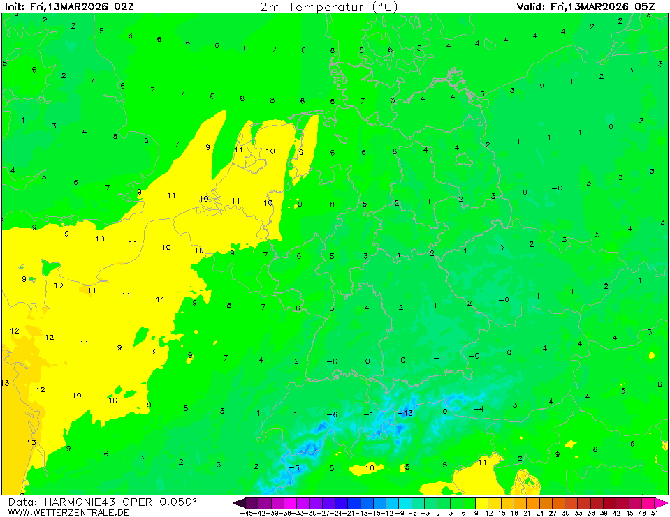ICONThe selected variable and region is available, but not for 2026-02-14, 05:00. You will switch back to the first available time step. ICON is the global weather forecast of the German weather service (DWD) with a grid spacing of approx. 13 km globally (Europe nest: 6 km). Model output is available up to 180 hours ahead for the 0Z and 12Z runs, and up to 120 hours for the 6Z and 18Z runs.