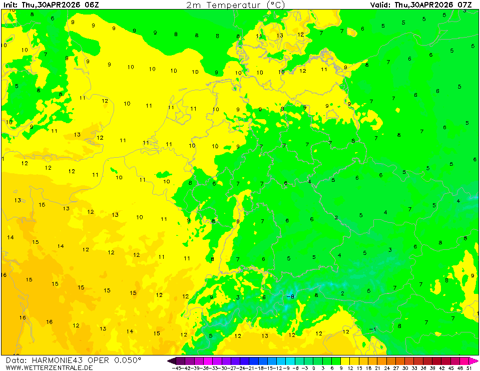ICONThe selected variable and region is available, but not for 2026-04-17, 07:00. You will switch back to the first available time step. ICON is the global weather forecast of the German weather service (DWD) with a grid spacing of approx. 13 km globally (Europe nest: 6 km). Model output is available up to 180 hours ahead for the 0Z and 12Z runs, and up to 120 hours for the 6Z and 18Z runs.